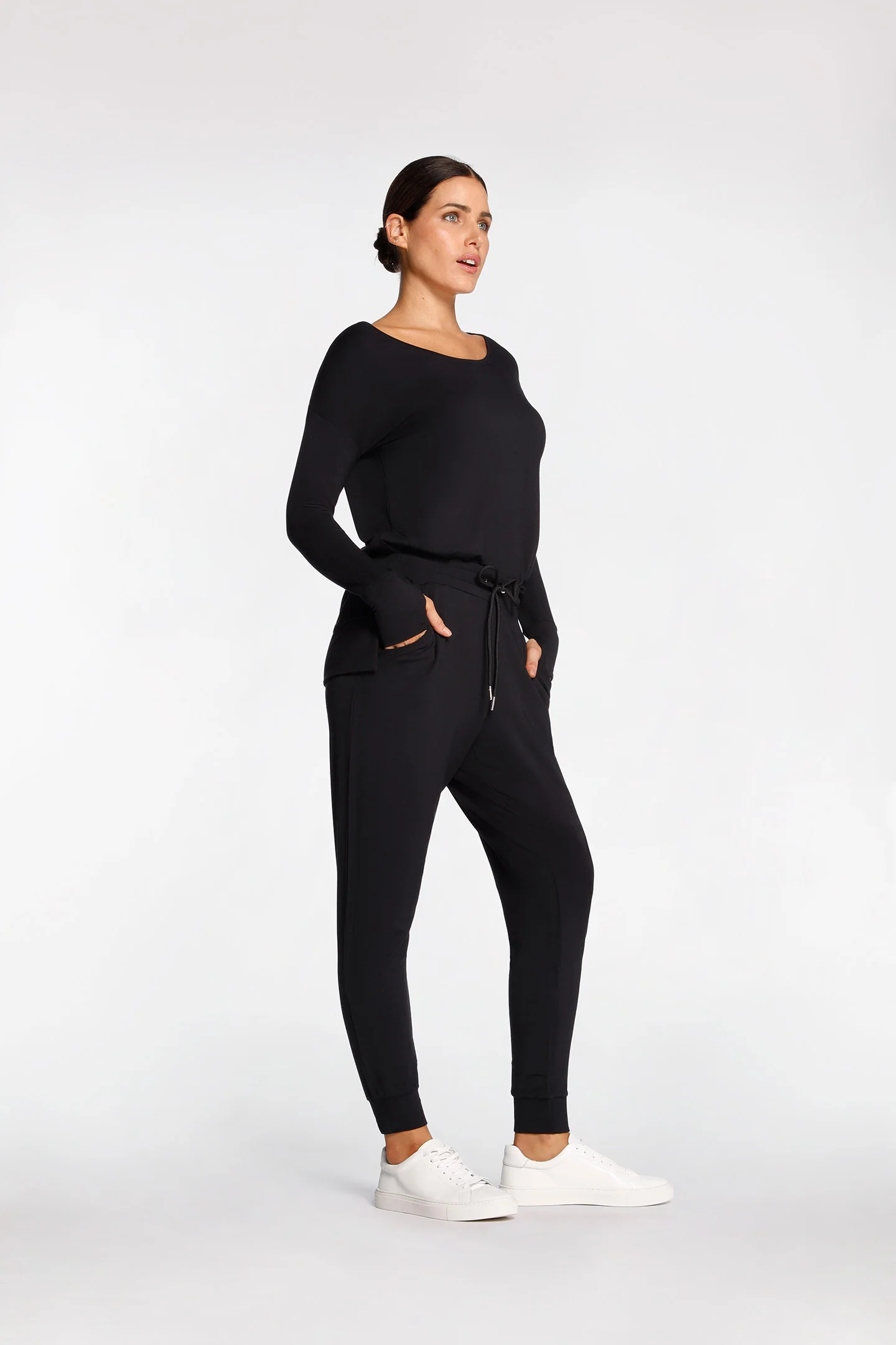 Relaxed fit TENCEL™ Modal + French Terry Sweater with thumbhole feature at cuff and wide scoop neckline.
