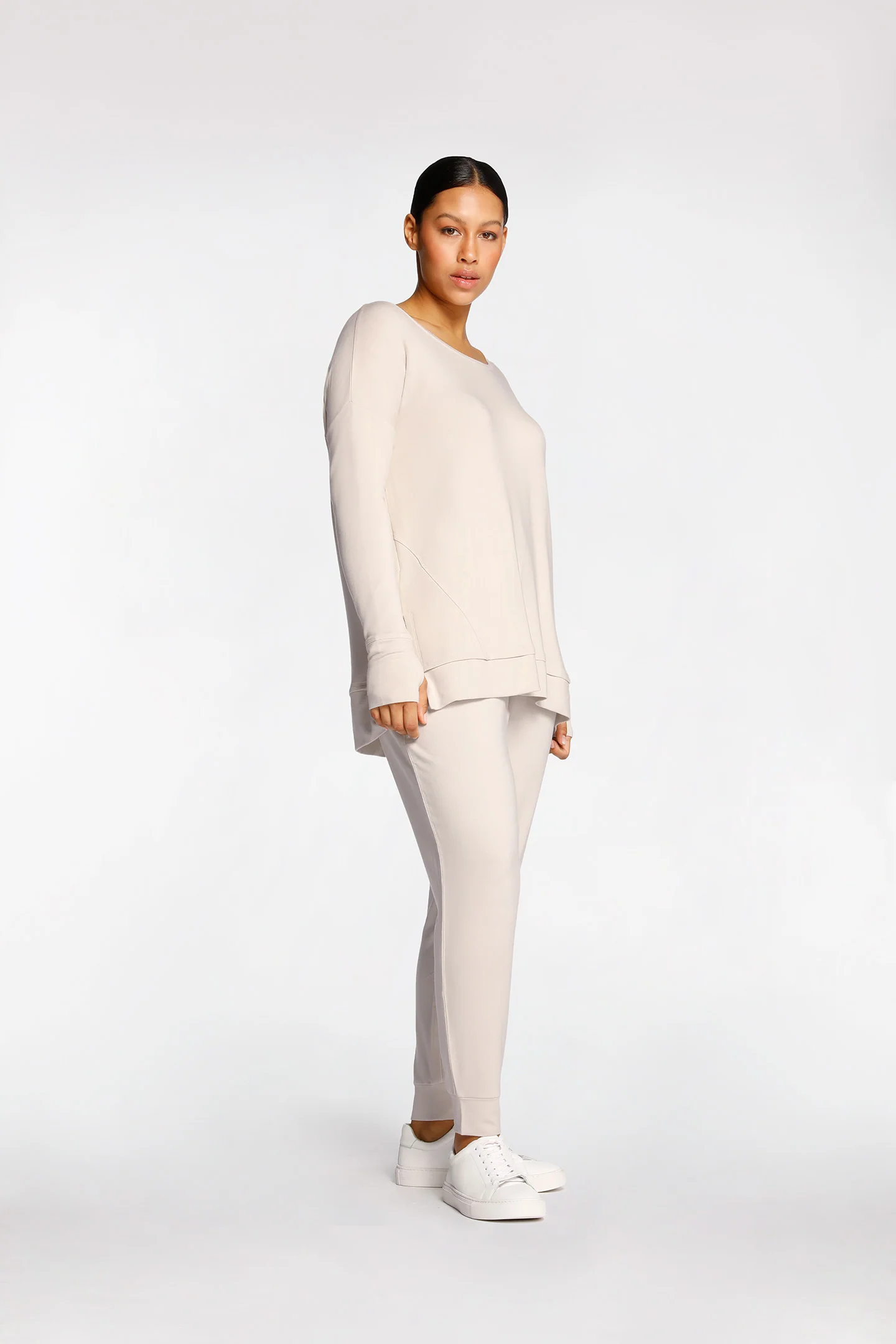Relaxed fit TENCEL™ Modal + French Terry Sweater with thumbhole feature at cuff and wide scoop neckline.