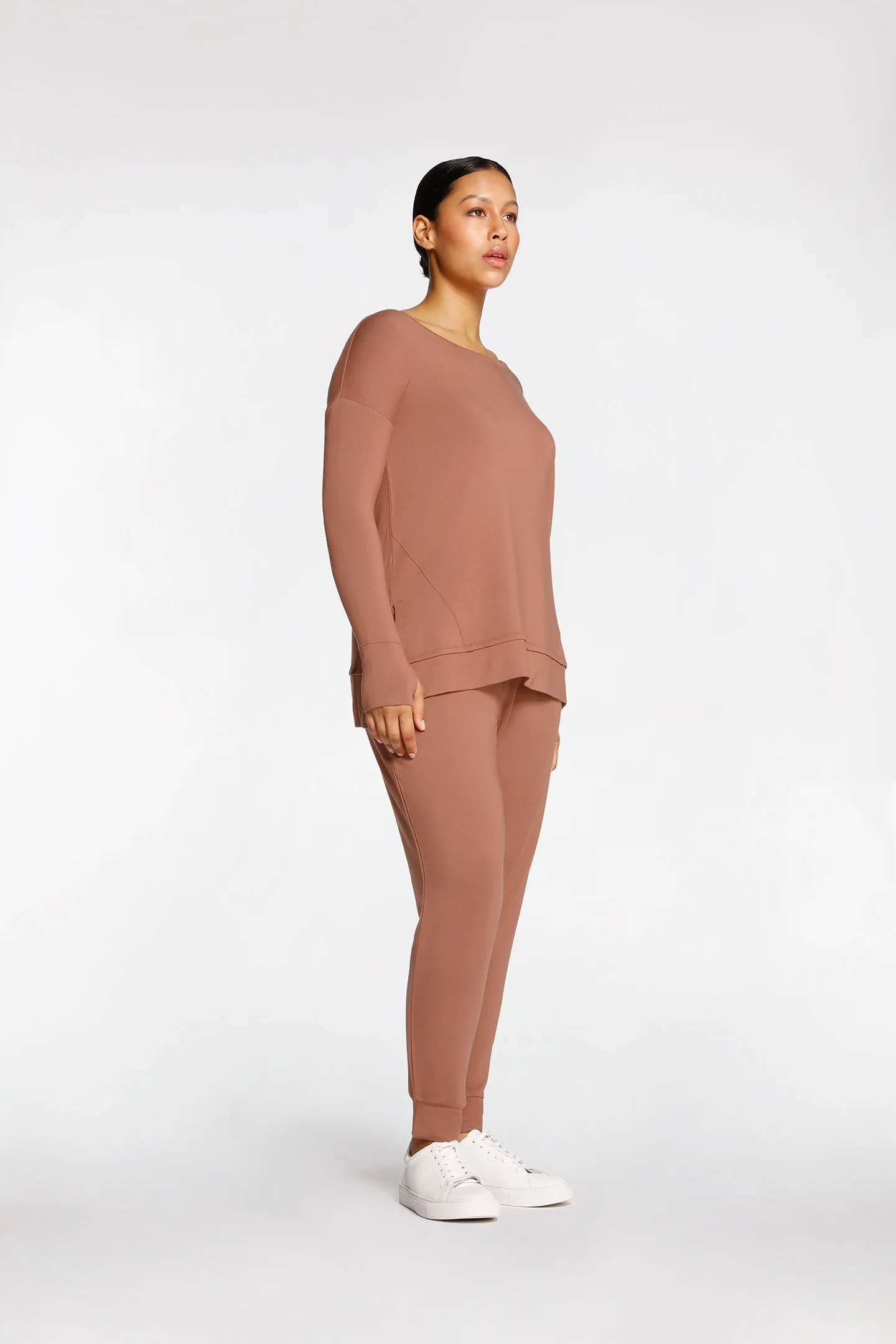 Relaxed fit TENCEL™ Modal + French Terry Sweater with thumbhole feature at cuff and wide scoop neckline.