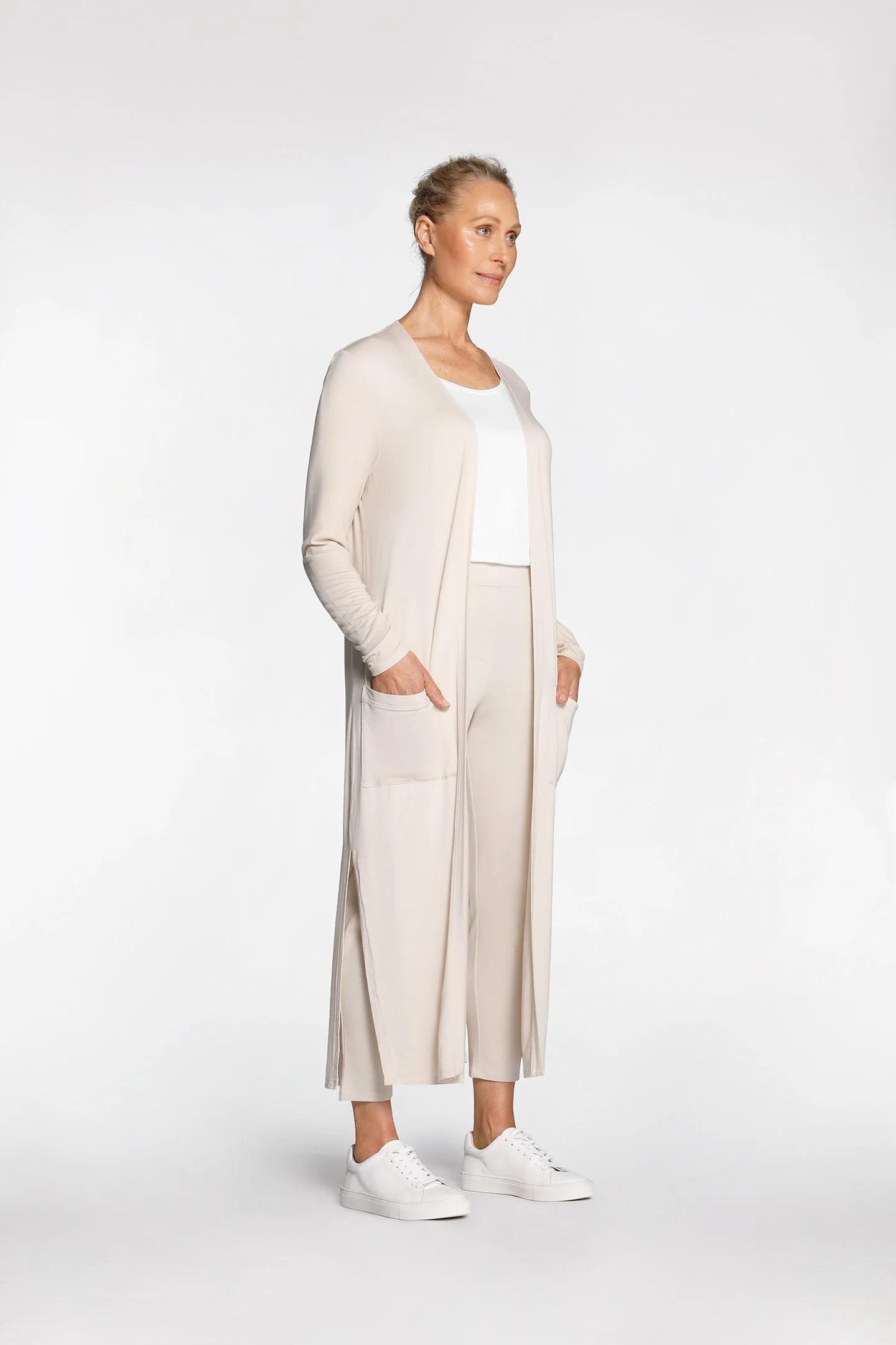 A maxi TENCEL™ Modal+Micro Cardigan with fitted full length sleeves and pockets. Stylised splits and relaxed fit make this a year-round wardrobe essential.