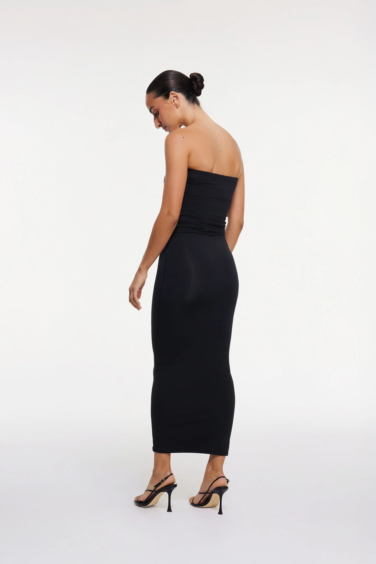 An ultra-stretchy and multifunctional shape that can be folded and ruched for wear as a dress, skirt or smoothing piece.