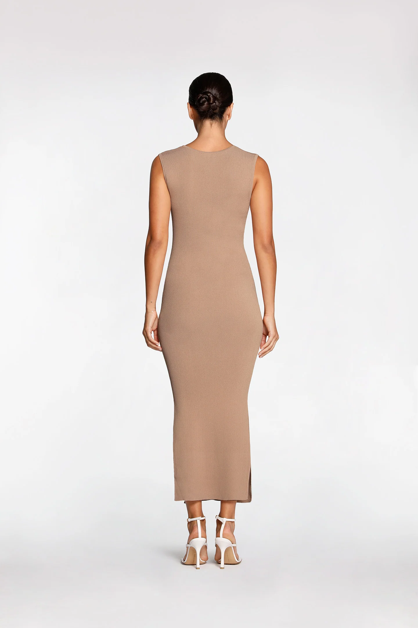 A weightless 4-way stretch rib dress that naturally skims the curves of the body. Reversible neckline for wear as a deep v or high cut style.