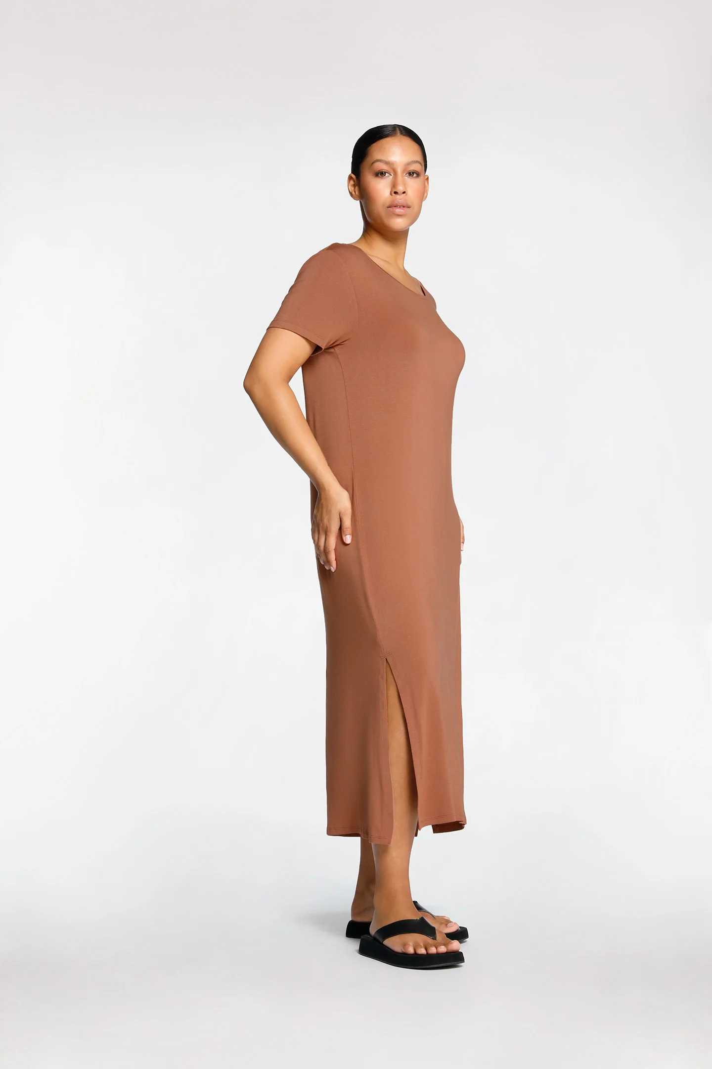 A classic T Shirt Dress with short sleeves, scooped neckline and straight fit that skims the hips.